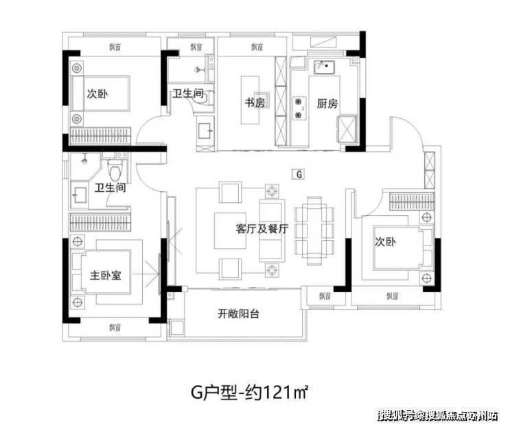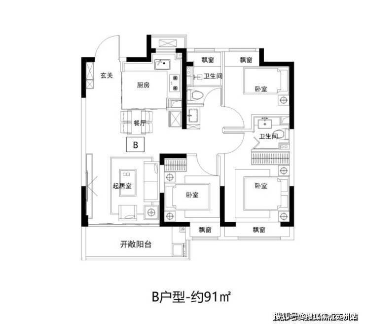 三开间朝南,创新双卫+公共洗漱台设计,解决早晚高峰排队难题