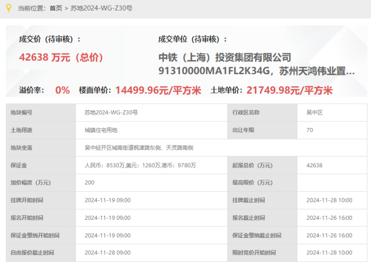 中铁咏月台,即,苏地2024-WG-Z30号地块项目,位于吴中经开区城南街道枫津路东侧、天灵路南侧,是2024年11月28日,中铁&天鸿伟业以底价42638万元竞得,成交楼面价14500元/平。