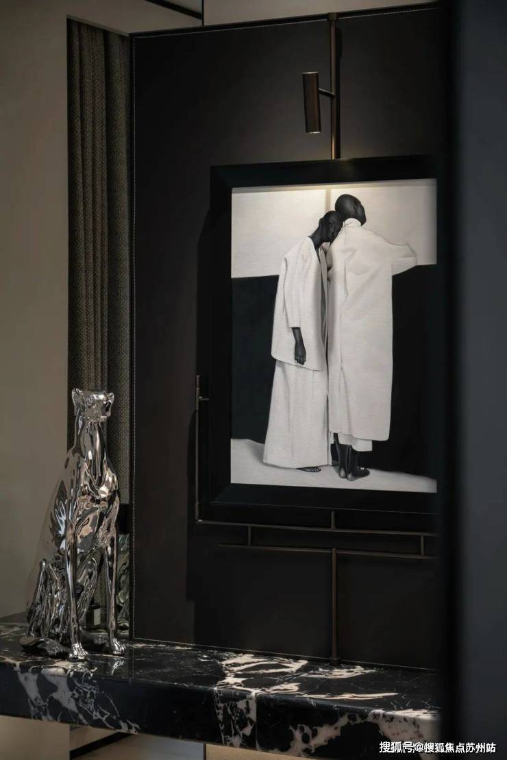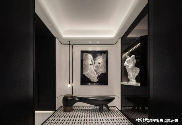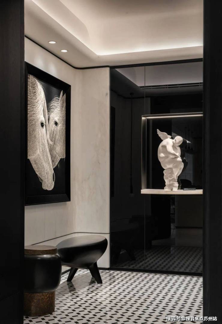 玄关黑白分明的色彩搭配,展现出一股现代都市的时尚气息。端景处的艺术画跃然眼前,画下的长凳,同样以黑色呈现,与上方的画作相呼应,深邃的色调和独特的笔触,成为玄关空间的点睛之笔。