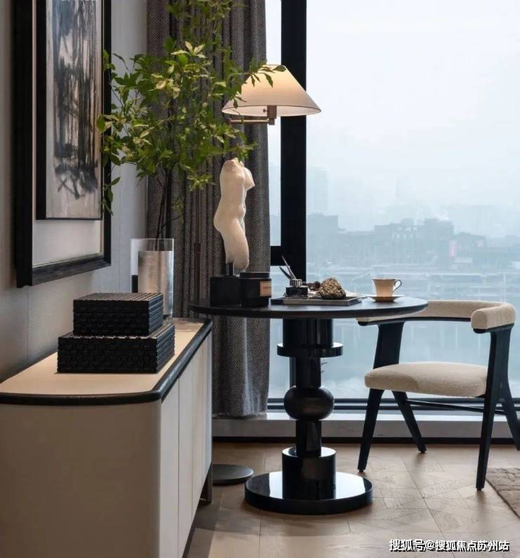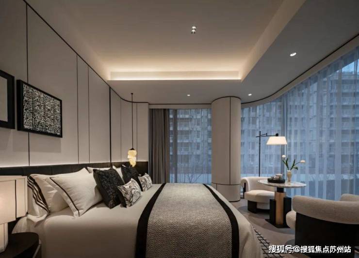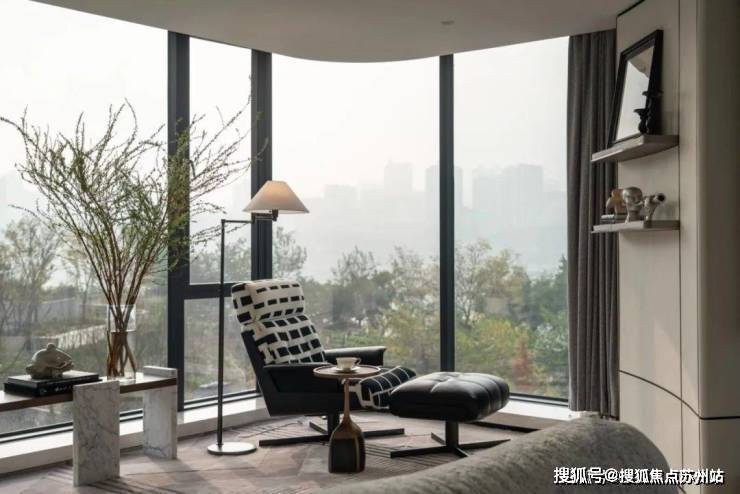 主卧以柔和的灰白色调为基底,陈设的点缀恰如其分。落地窗前,一张休闲椅与小圆几静静伫立,成为欣赏江景的美好角落。生活在此,成为一场永不落幕的风景。