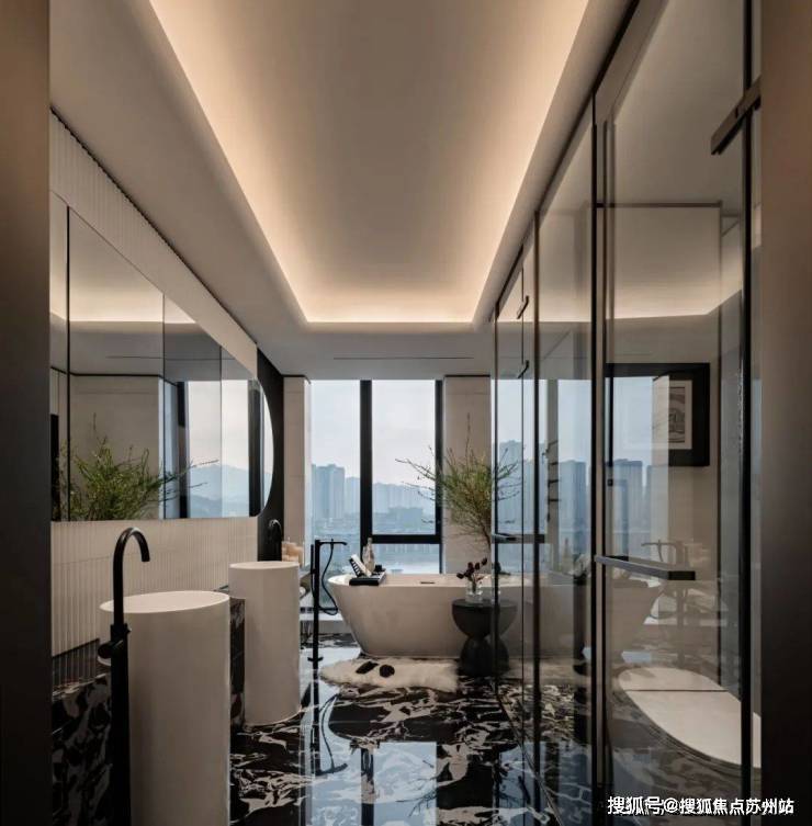卫生间地面的宝格丽黑石材,与白色的基调形成鲜明对比,造就空间层次与品质。