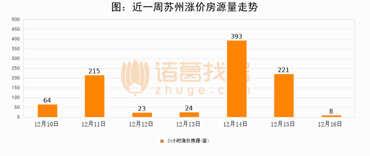 根据诸葛找房数据显示,苏州24小时涨价房源量为8套,较12月15日减少213套,环比下降96.4%。与此同时,涨价房源占比小幅回落,对于购房者来说是一个入市窗口期,购房者可抓住时机入市。