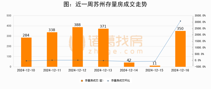 从存量房来看,2024年12月16日苏州存量房单日成交350套,比昨日增加339套,环比上涨3081.8%。从近一周存量房成交来看,苏州存量房日均成交套数为254套,12月16日单日成交350套,高于近一周平均水平37.8%。