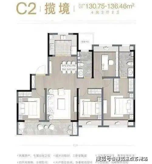【三】:136㎡的四房两厅两卫,空间宽敞,功能分区明显。客厅和餐厅相连,增加了空间的通透感。主卧室和次卧室都拥有良好的采光和视野。