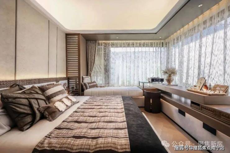 建面约122㎡创意展示间实景,具体以实际交付为准,这个尺度感一般也只有在约140㎡以上的大平层中能看到。主卧豪华套房的设计+约270°的巨型飘窗,这个尺度感和实用性真的很强。