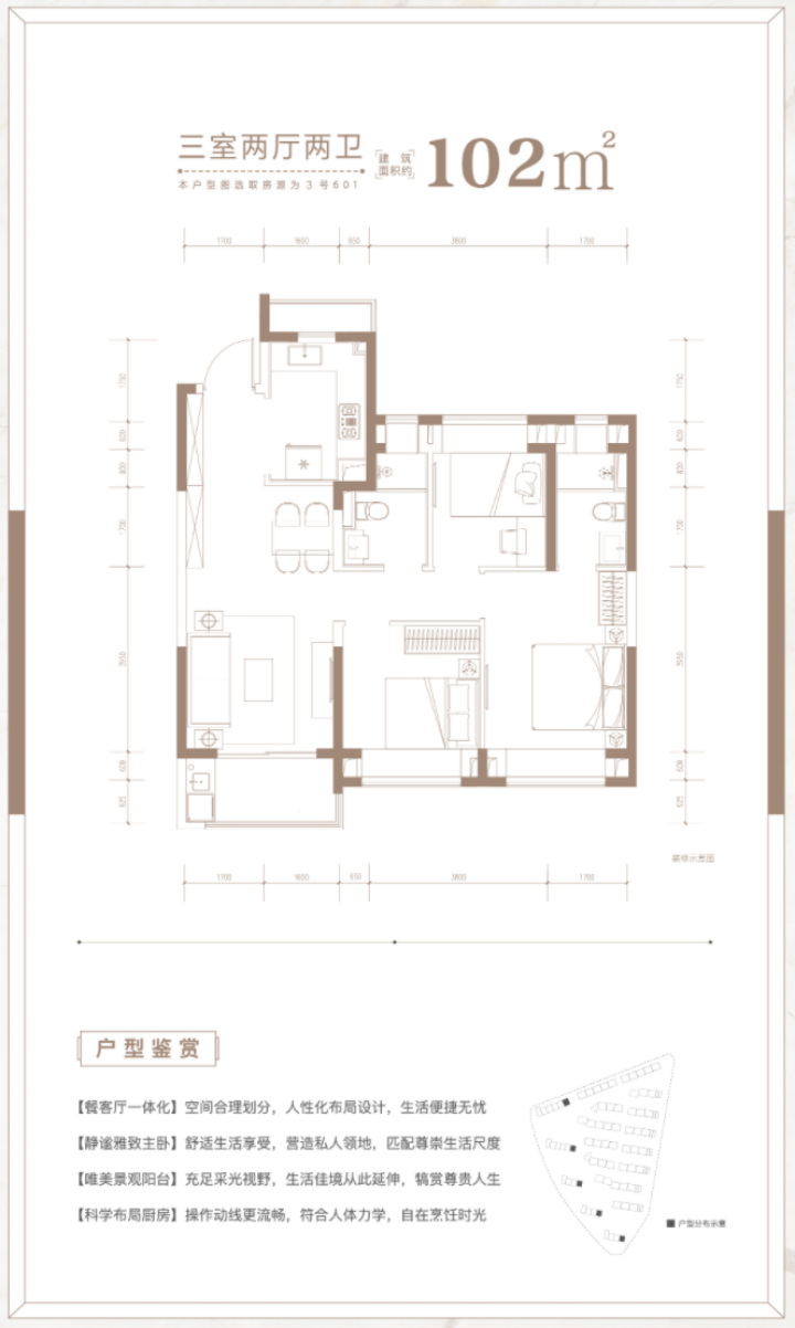建面约102㎡3房2厅2卫户型,做到了三开间朝南+双朝南卧室带飘窗+动静分离+卫生间干湿分离,采光面拉到极致!是一个非常方正的户型.