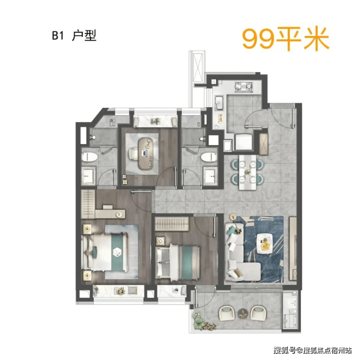 建面约99㎡3房2厅2卫(边套)