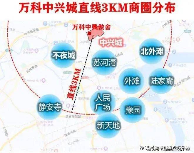 中兴城也是如今上海核心商圈环绕的城心地段,直线约3公里(信息来源:百度地图测量)范围汇集了人民广场、静安寺、陆家嘴、北外滩等超级商圈