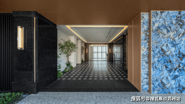 10#楼入口处的大面蓝宝石岩板,以天然纹理与金属镶嵌碰撞出低调奢华,门厅地面采用地砖拼花设计、墙面艺术漆与岩板的混搭,让空间质感层层递进。