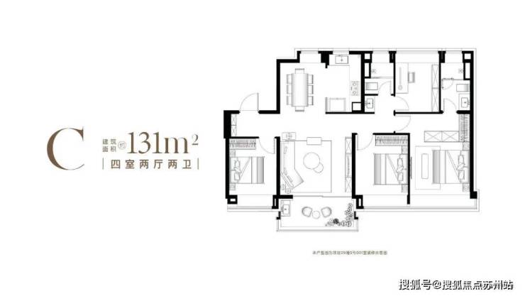 建面约131㎡C户型,1梯2户无连廊,精装交付,得房率约77-78%,总价约650-690万左右;