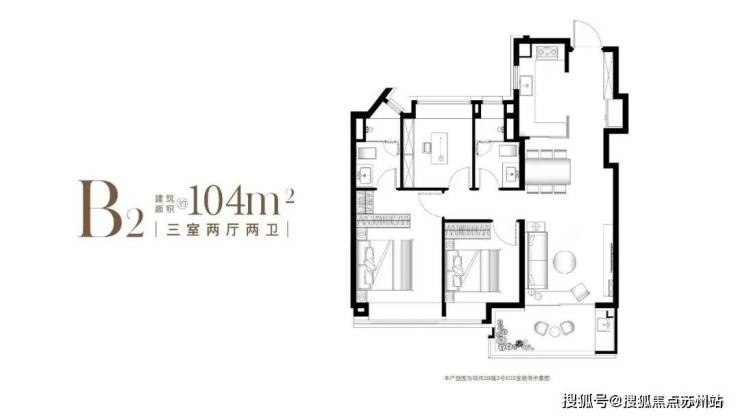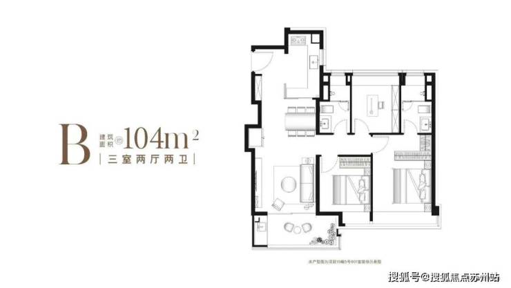 建面约104㎡B户型,2梯4户,其中B2户型为中间套,有连廊影响,精装交付,得房率约77-79%,总价约450-510万左右;