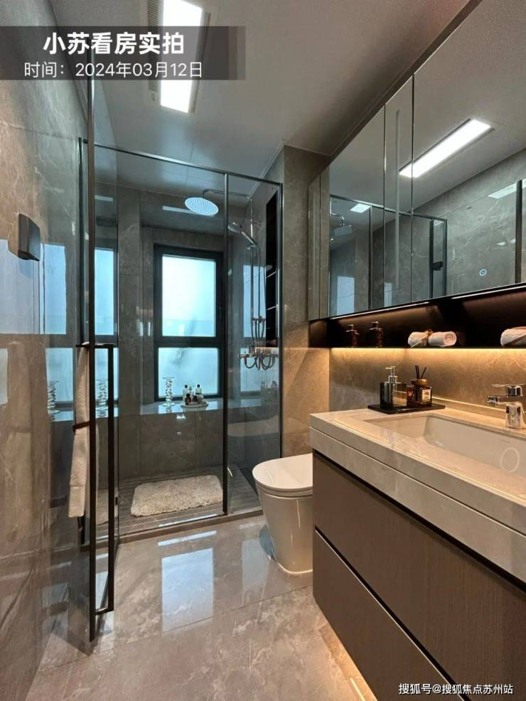 镜柜为交付标准,主卫镜柜配备美妆冰箱;奥普、欧普或同档次品牌风暖浴霸;铝合金框加钢化玻璃淋浴房隔断;