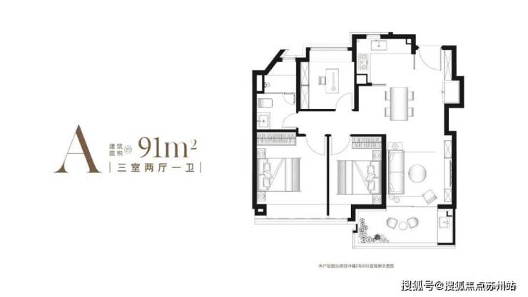 建面约91㎡A户型,2梯4户,该户型均为中间套,有连廊影响,精装交付,得房率约77-79%,总价约400-430万左右;