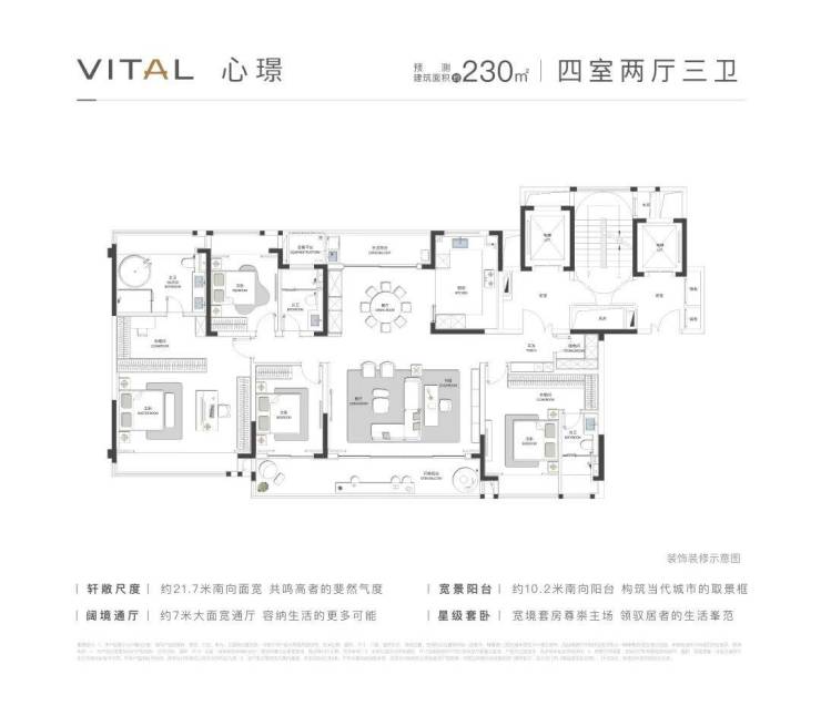 项目主打纯粹大平层户型,只为少数家庭珍藏。无论是170平户型、197平户型还是230平户型,都旨在提供奢阔的居住体验。 【观璟】约170㎡,格局方正好用。 【怀璟】约197㎡,空间阔绰从容。 【心璟】约230㎡,尺度堪称奢阔。