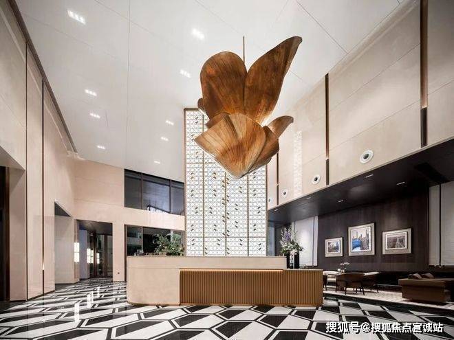 双归家大堂的地面采用香格里拉黑通铺,墙面选用奥特曼米黄,背景墙则以莫奈花园大理石呈现。