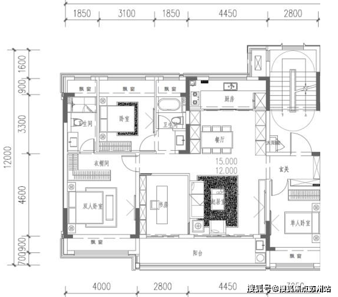 该户型2大看点:客厅三联大阳台+大面宽主卧,厨房带家政间。