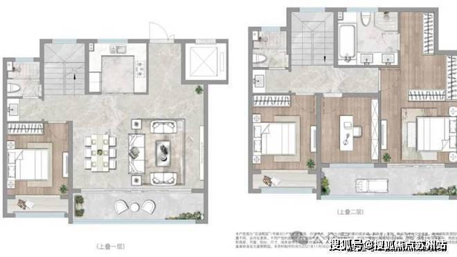 叠墅:上叠约160㎡四房两厅三卫,带约60㎡露台;下叠约180㎡四房两厅三卫,带40-100㎡庭院,一梯两户设计。