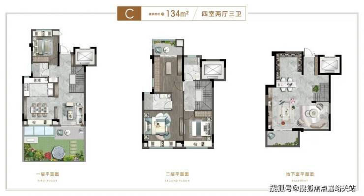 约134平下叠4房户型,紧邻贝港河畔,纯美水岸筑造诗意栖居,全房共有2层并附赠全明地下室,地上首层为生活区,设计南向绿化空间,做到真正的有天有地有花园!