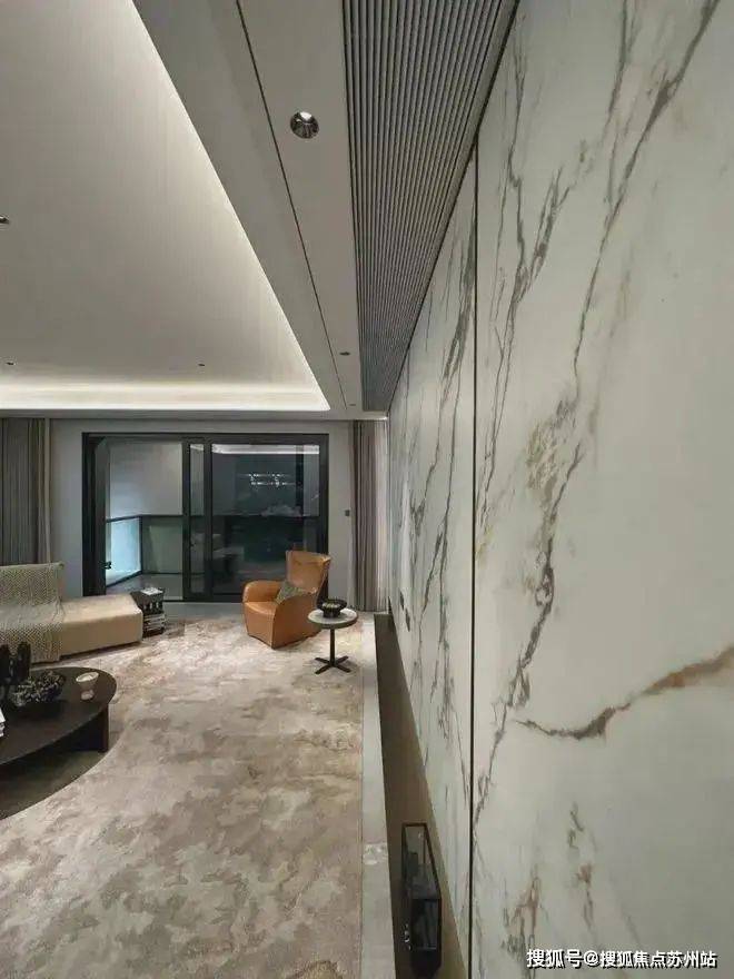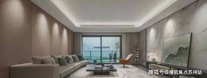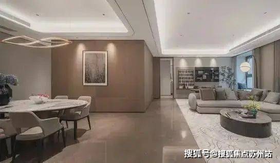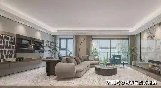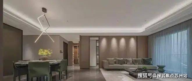 客厅吊顶采用双层设计,为空间带来层次美感。沙发墙面实用灰色软包材料装饰,金属线条进行点缀,优雅不失高级感。