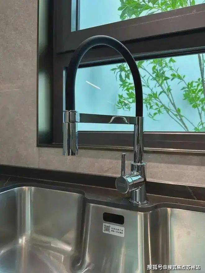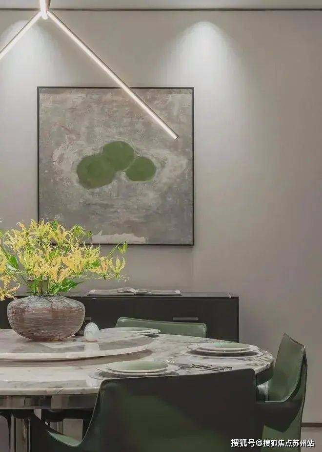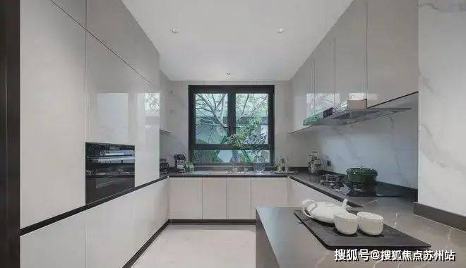 餐厨空间也采用同样的设计手法,增加内嵌式储物空间,让开放式厨房进一步宽敞,许多物品也有了摆放的空间。落地窗提高用餐愉悦感。