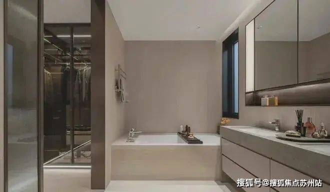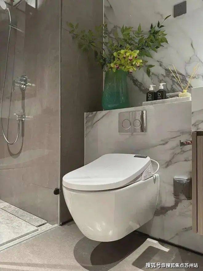 盥洗室采用独立空间,哑光黑的器具搭配大理石墙面,呈现出现代设计美感。