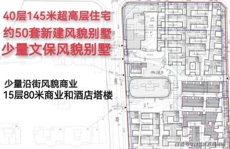 根据公示,项目西半部分096-2地块内规划1幢40F超高层住宅、14幢2-3F风貌别墅,和1幢15F商业酒店、1幢3F商业楼.酒店、商业位于地块西南角.