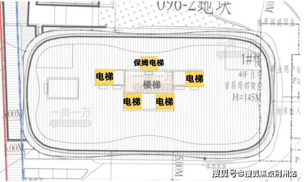 西边地块135米超高层,核心筒布局揭示了项目对垂直交通的极致追求.楼栋或将配置5部电梯服务2户住宅单元,具体为顶部消防电梯兼家政梯独立运行,中间两户各享两部专属电梯,外加共用消防梯.