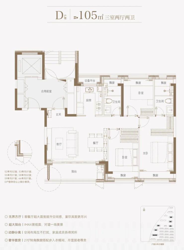 边套的餐厅、主卧和次卧,设置有多个270°全景飘窗,室内通透明亮。