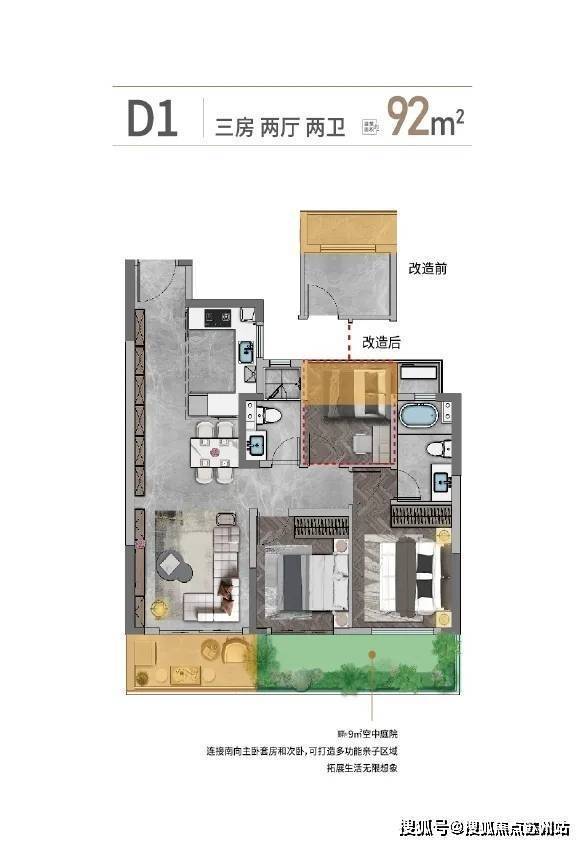 户型非常方正,三开间朝南,动静互不干扰。LDKG一体化的设计,让家庭聚会社交自在从容。南向面宽约9.45米,生活阳台连接客厅,约9㎡的空中庭院连接主卧套房和次卧,拓展生活无限想象。