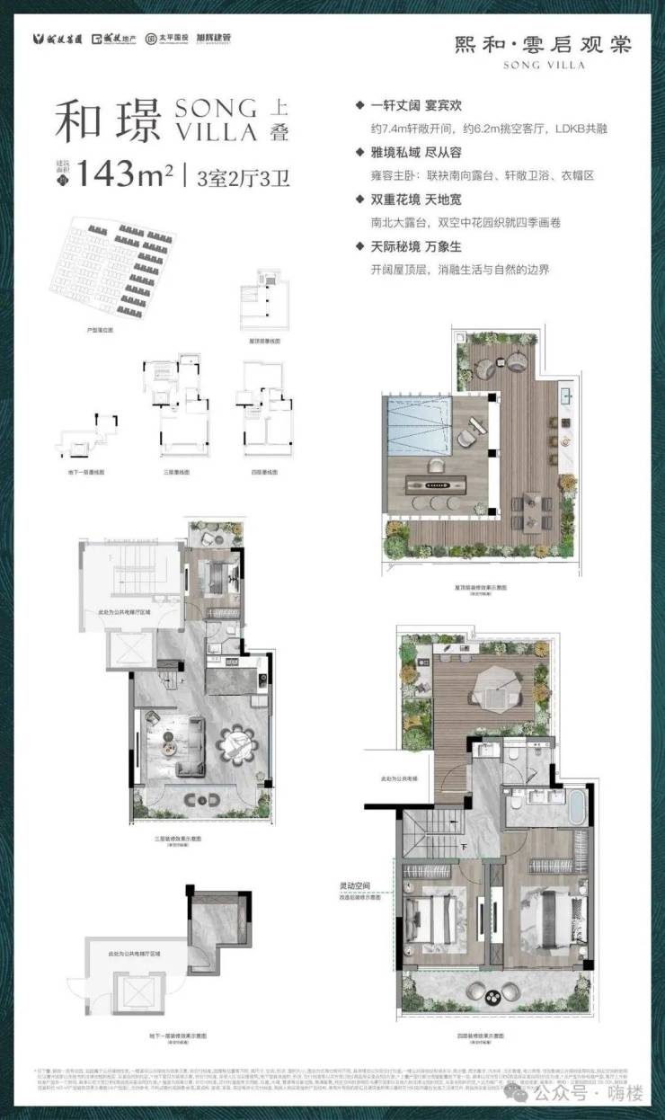 上叠(约143㎡): 3房3卫的设计,同样有客厅挑高赠送。它拥有南北双露台,通风采光极佳。最浪漫的是屋顶,还送了一个星空大露台,晚上搬张躺椅上去,看看星星,聊聊天,这才是生活啊。