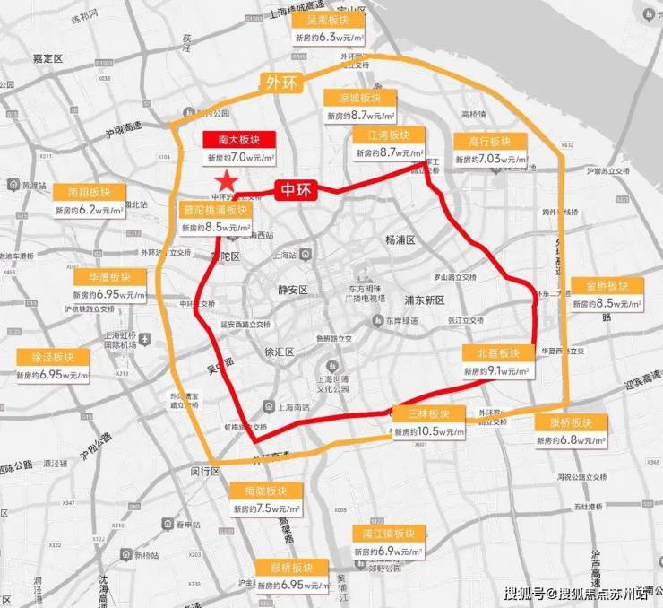目前中环区域新房备案价参考,杨浦中环: 9.8-10.5万元/㎡;普陀桃浦: 8.1-8.5万元/㎡;虹桥开发区:9.6-10.2万元/㎡;前滩商务区:12.5-13.2万元/㎡。