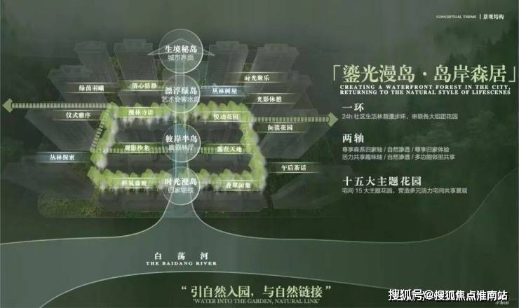 2、一环两轴十五园,构建都会山水聚场:以“山水聚场”理念,规划“一环两轴十五园”景观布局,将水岸、岛屿、森林、花园、树屋作为园林节点,形成“行在景中、坐在岛中、游在林中、意在境中”的美学表达,营造出沉浸式山水活力场域。