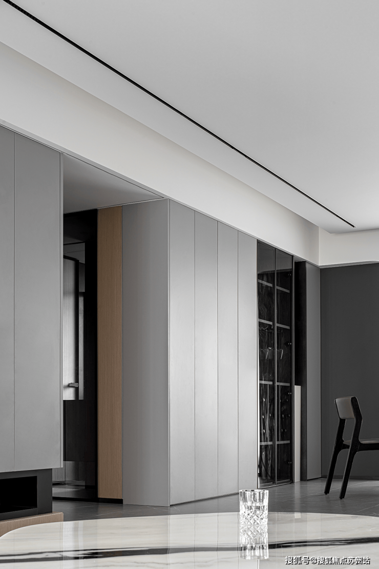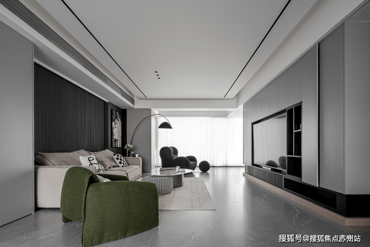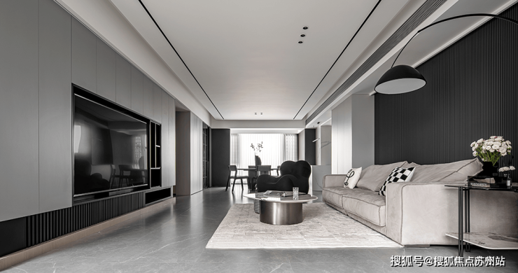 双层吊顶设计,巧妙地赋予了空间更丰富的层次感。客厅沙发的背景墙采用灰色硬包材料,点缀金属线条,简约中透露着大气与优雅。
