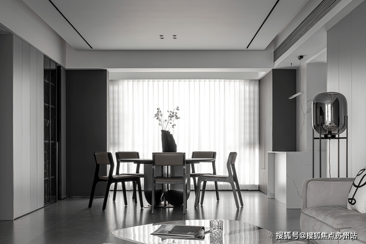 The open layout throughout the design has thrown away the shackles of traditional closure, so that each functional area naturally integrates with each other. Black shaped sofa like a dynamic melody, injected the vitality of the space, its many convex design, but also fit the body curve, for the residents to bring comfortable experience.