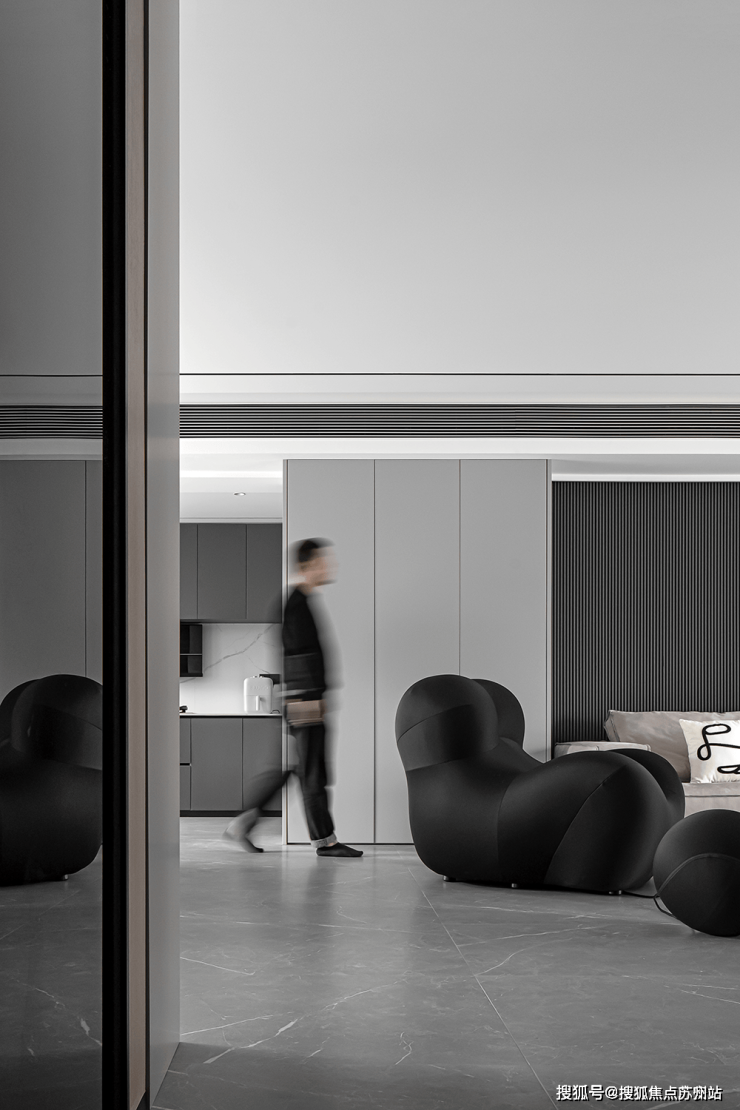 设计中贯穿的开放式布局,抛却了传统封闭的束缚,使各功能区自然而然地相互融合。黑色的异形沙发如一曲动感的旋律,注入了空间活力,其多处凸起的设计,更是贴合身体曲线,为居者带来舒适无比的体验。