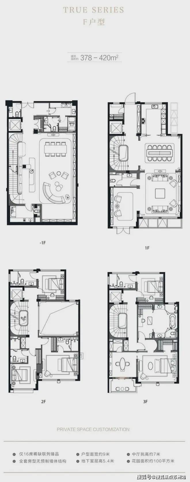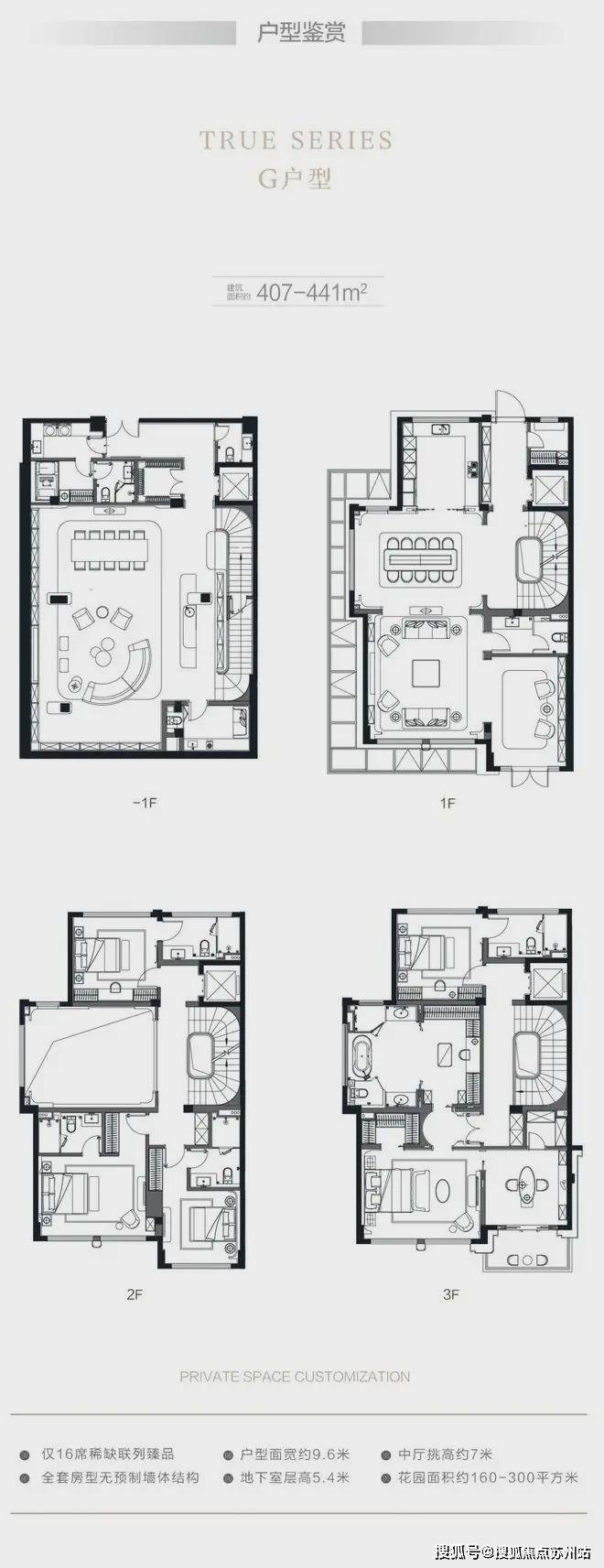 在售户型:建面约310-410平米,地上三层地下一层
