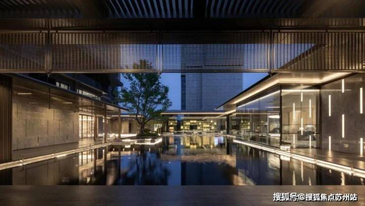 二重中心水景融合苏式园林独有的叠山理水艺术,运用流动且空灵的设计手法,打造出一个充满意境的景观空间。在这里,“一峰耸立如太华千寻,一勺波光似江湖万里”,生动展现了山水之间的诗意境界。秉承“曲则全”的哲理,结合东方美学的现代摄影视角,呈现一场视觉与心灵的盛宴。