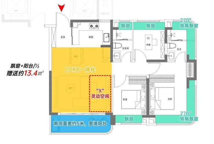 经典动静分离户型,LDKB一体化设计,三开间朝南,南向整体面宽约11米,搭配约5米宽境阳台;