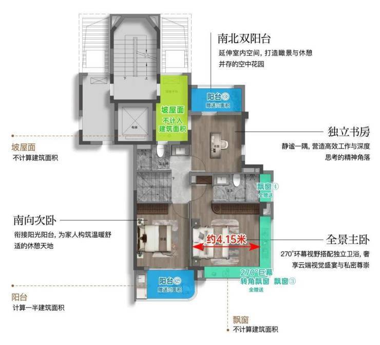 该户型附赠4个飘窗+3露台+1阳合½+挑空+闷顶等,实得率约135%!