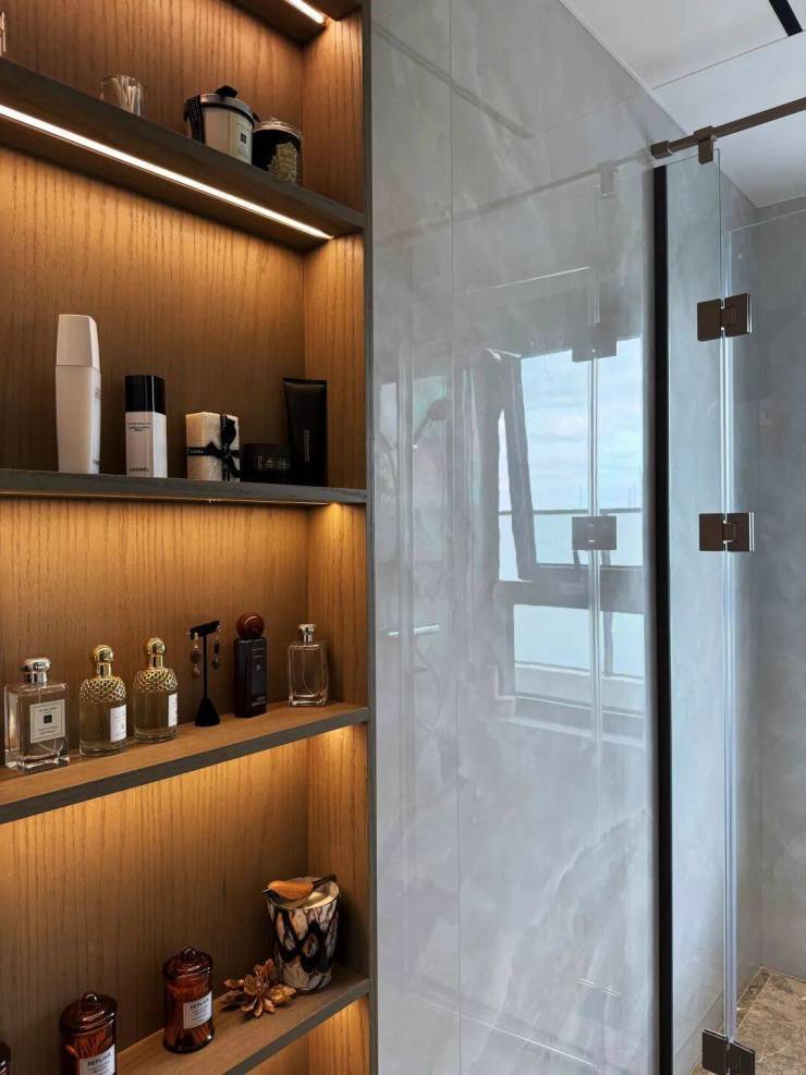 包括卫生间的墙面以及地面均采用了大量的岩板和石材进行铺设,主卫镜柜配置美妆冰箱。