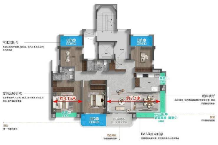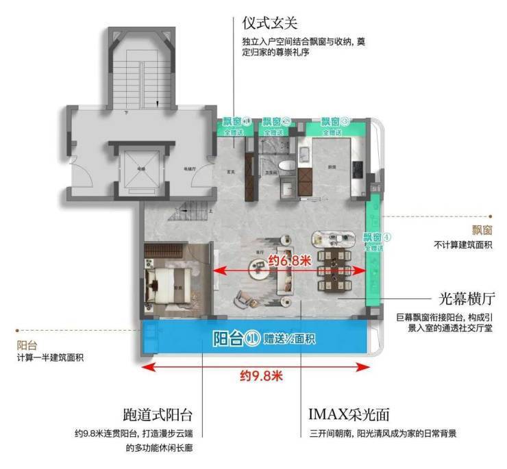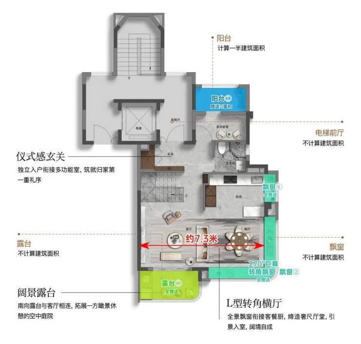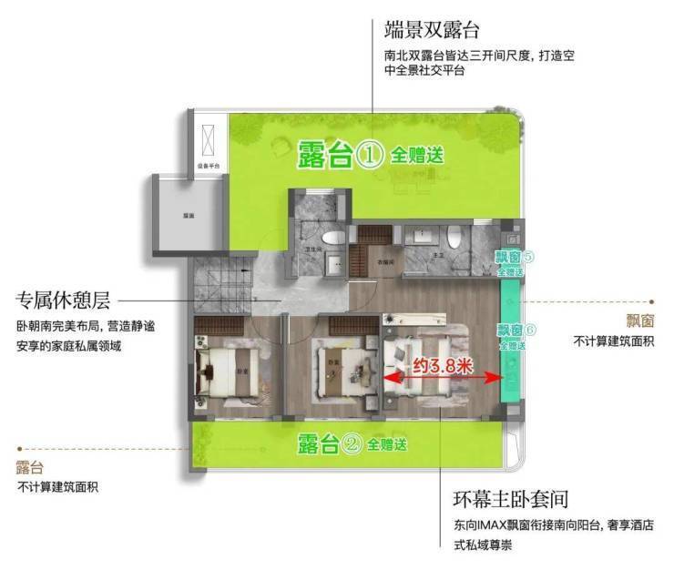 客厅附赠南向露台,同时厨房也附赠飘窗台面(端户),均不计入建筑面积;