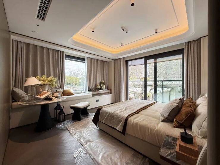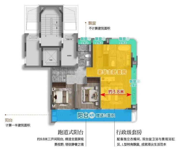 主卧套房南向面宽约3.8米(不含飘窗),边套户型附赠侧边巨幕飘窗,主卫附赠270°弧形转角飘窗;