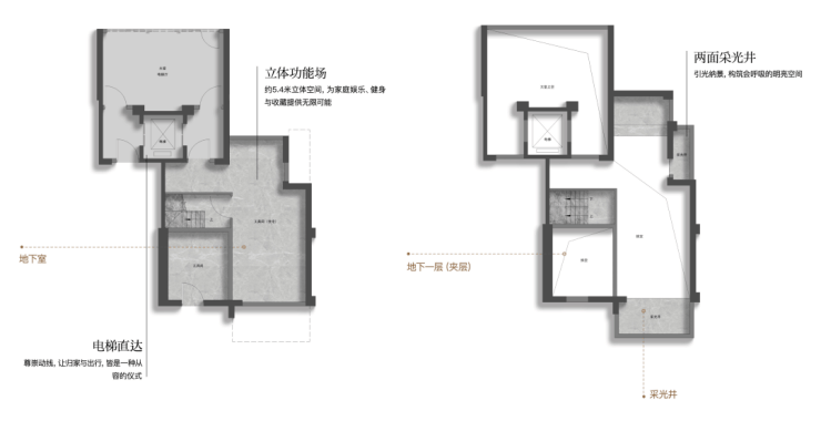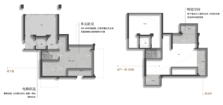 约5.4米地下室挑高,三双面采光井,极致的地下空间感受,可自由定制个性化空间及场景,比如设置家庭娱乐、健身、私人工作室等。