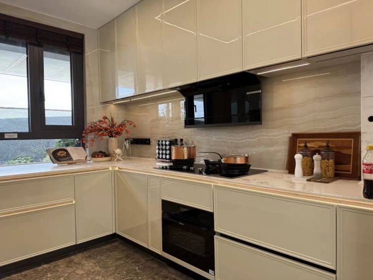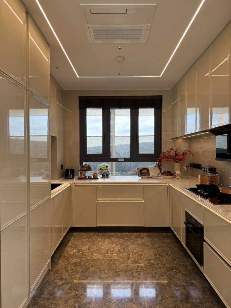 厨房所有的橱柜均采用钢琴烤漆工艺,很有质感。