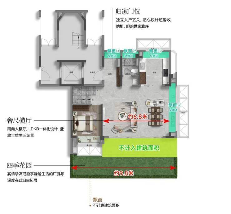 超大独立入户玄关且附带飘窗+大量收纳柜空间,南向整体面宽约9.8米,其中客餐厅约6.8米,南次卧约3米;