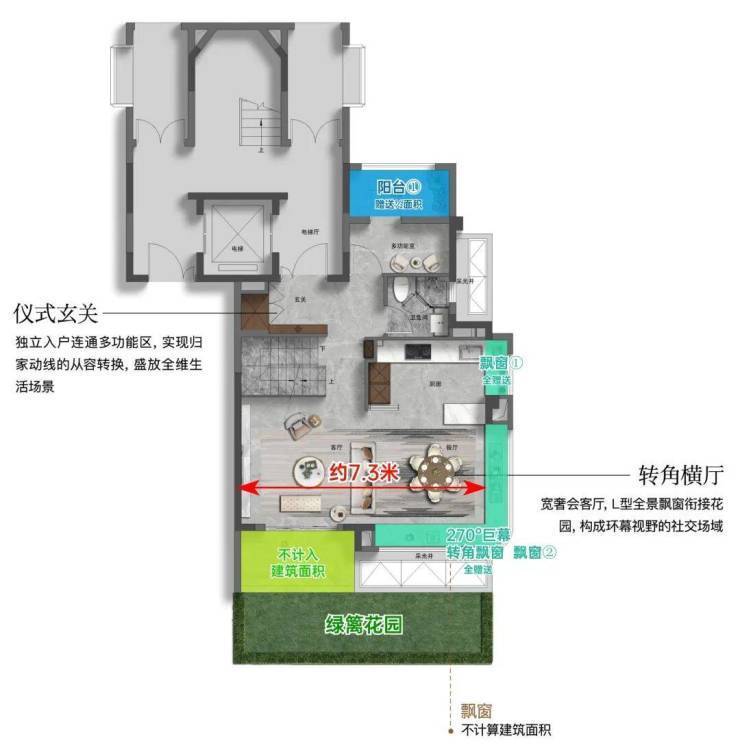 独立入户玄关,并设置大件收纳空间,南向约7.3米面宽客餐厅+附赠270°弧形巨幕转角飘窗;