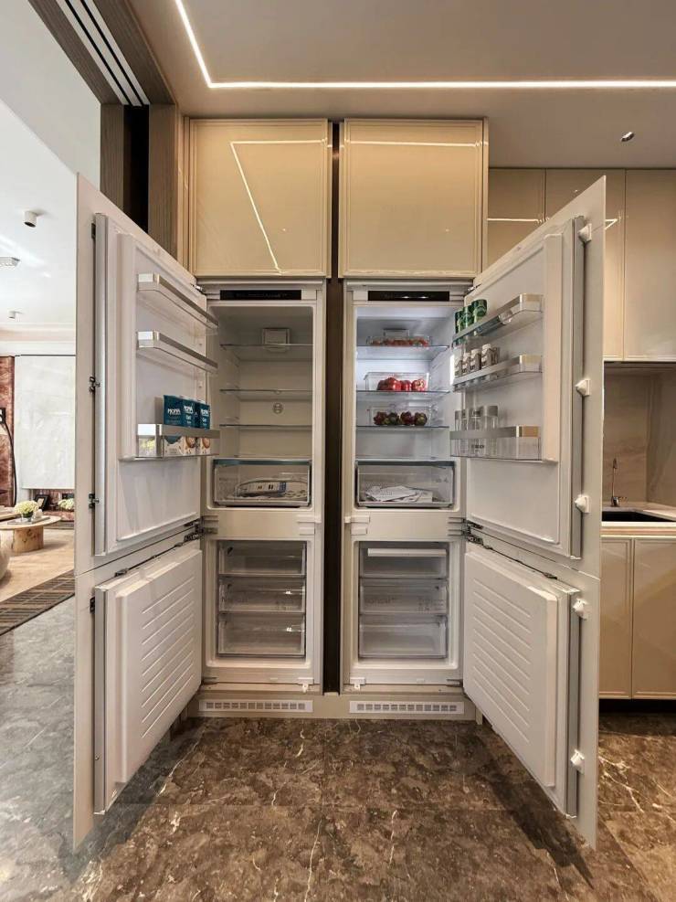 配置博世五件套,包含油烟机+三眼燃气灶+洗碗机+蒸烤一体机+两个嵌入式单开门冰箱;高仪大单槽搭配可抽拉水龙头,并且还加装了美而浦净水器以及汉默斯垃圾粉碎机。