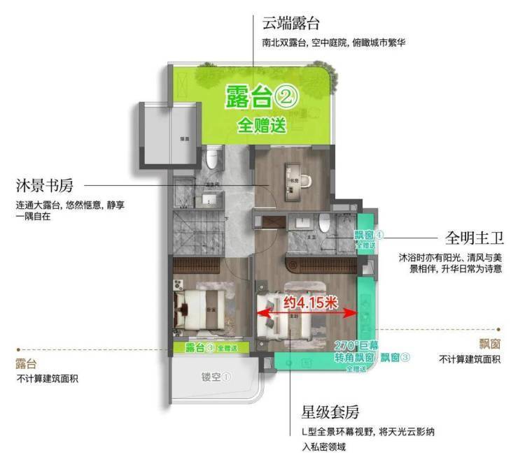 主卧套房南向面宽约4.15米(不含飘窗),边套户型主卧附赠270°转角飘窗,且主卫也附赠飘窗;
