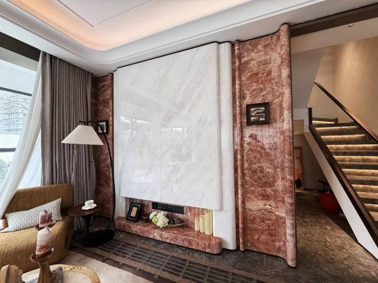 地面采用索菲特酒店同款苏格兰灰天然大理石,电视背景墙采用安妮白玉大理石搭配米兰红大理石,客餐厅其余的背景墙均采用胡桃木木饰面。