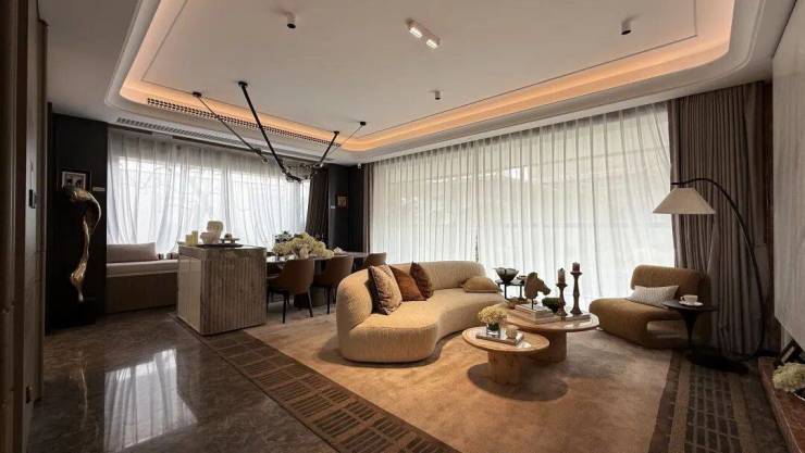 建面约144-181㎡叠墅,最新一代的产品体系,高标准精装交付,附赠地下室、闷顶、露台等可拓展空间,超高实得率,从样板间实际感受下来,空间感极为舒适。